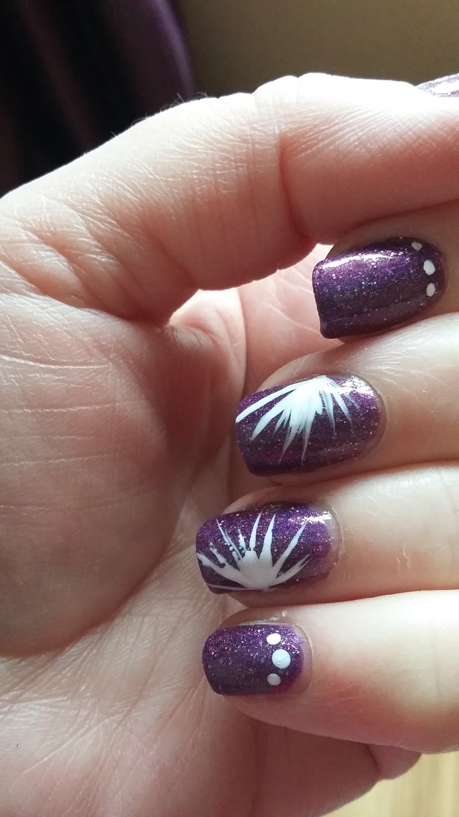 The parcel of gorgeous Robin Moses Nail Art glitter polishes arrived as we were getting ready to go to Dublin for a concert at The Olympia (Broken Witt Rebels and Kaleo, amazing, both of them) and as I already had brushes from Robin Moses I thought I better be brave and try them. I painted with OPI Alpine Snow on top of the purple glitter and used a dotting tool (actually an embossing tool from my craft stash) to make the dots. Top coat is Seche Vite